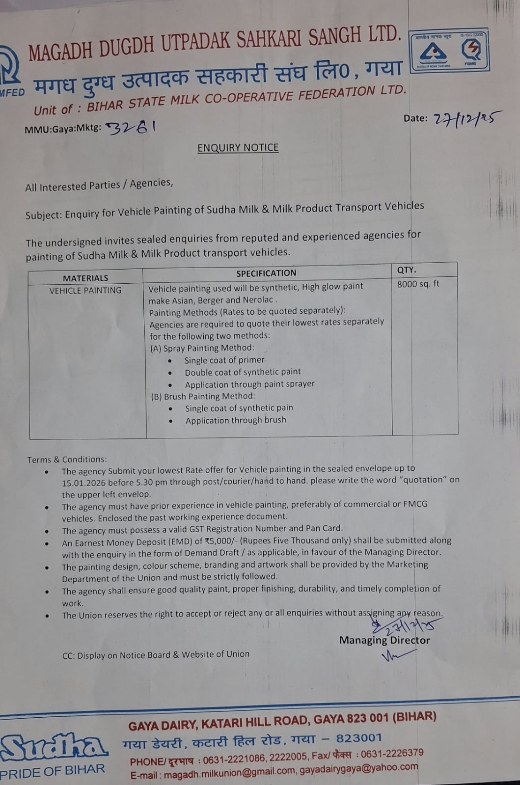 The undersigned invites sealed enquiries from reputed and experienced agencies for painting of Sudha Milk & Milk Product transport vehicles.