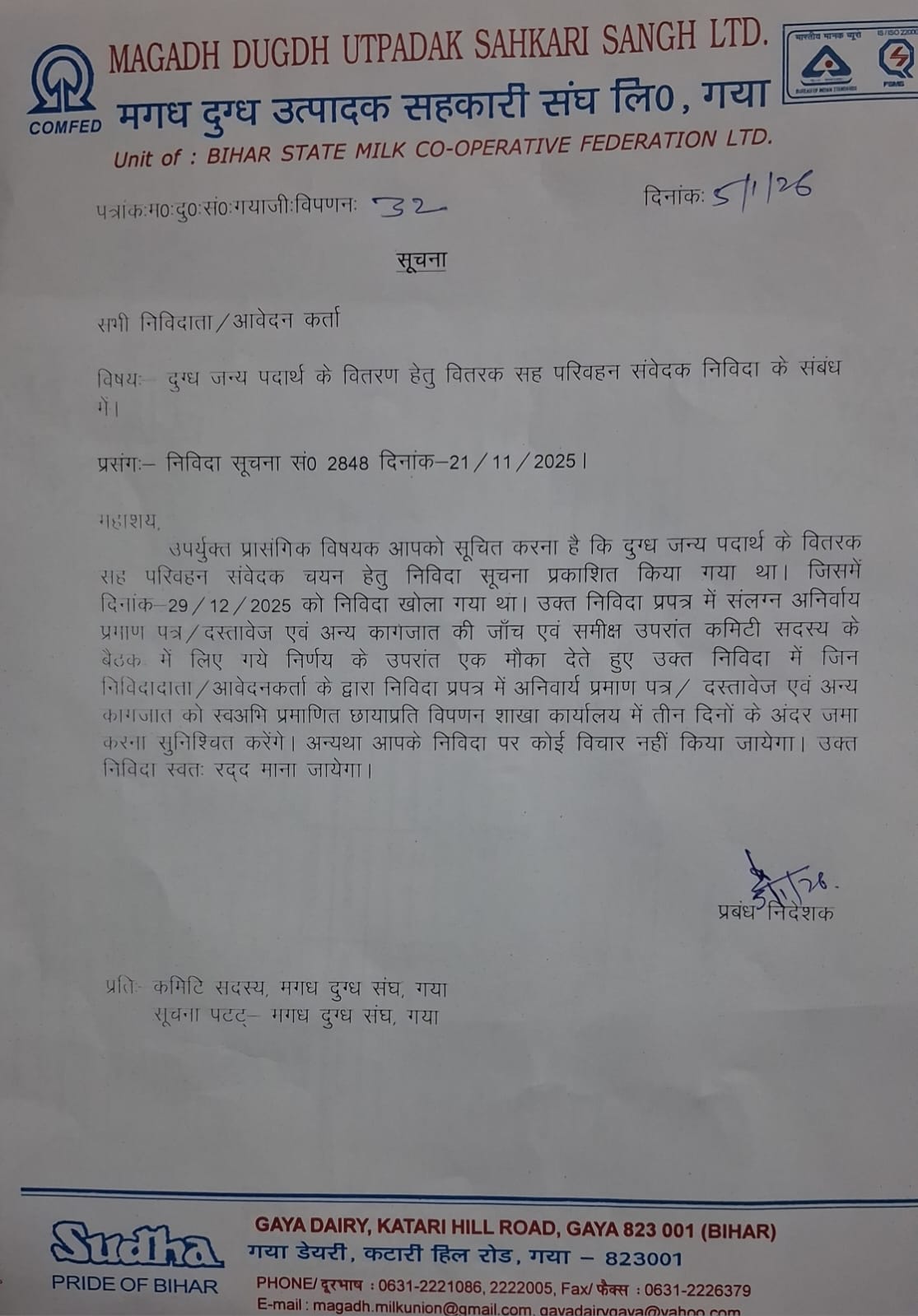 Tender Notice for DISTRUBUTOR of SUDHA MILK PRODUCT & OTHER PRODUCT in different routes of Magadh milk union Gaya.